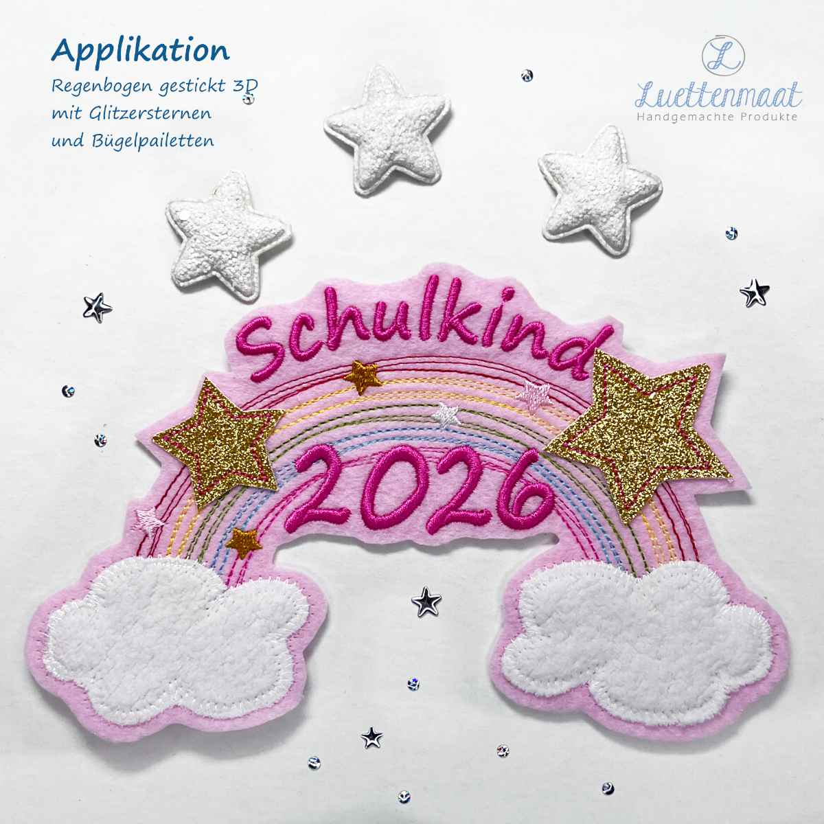 Unsere hochwertige 3D-Applikation für Schultüten von Lüttenmaat ist das perfekte Zubehör für eine personalisierte Schultüte zur Einschulung, zum Schulanfang und für den Start in die 1. Klasse. Jede Applikation wird individuell gestickt und besteht aus Kunstleder, Glitzergewebe, hochwertigen Stoffen und anderen Premium-Materialien, die eine langlebige, detailreiche und stabile Stickapplikation gewährleisten.