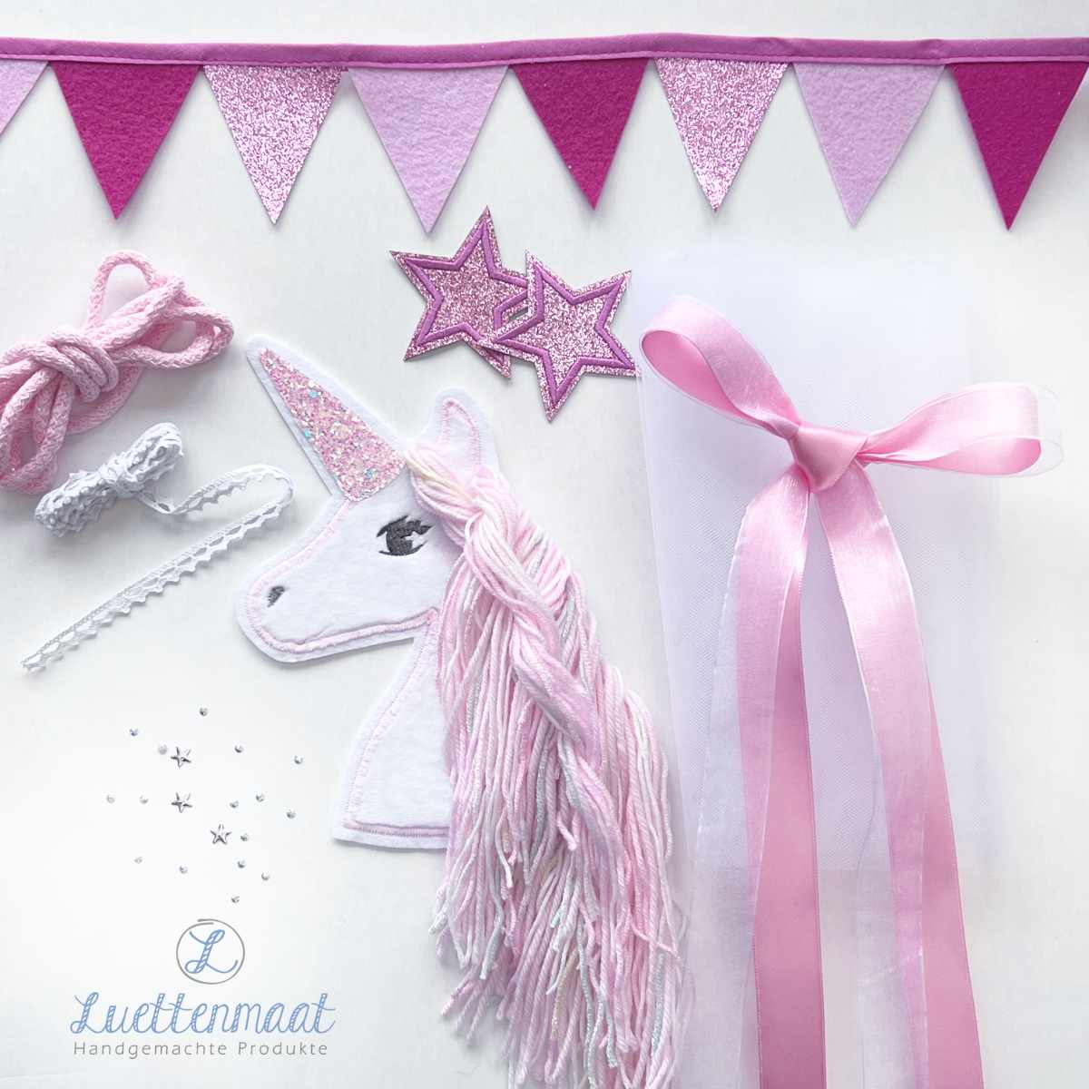 Material: Untergrund Filz , Baumwollstoff, Bänder als Mähne aus Wolle Horn aus Glitzer
