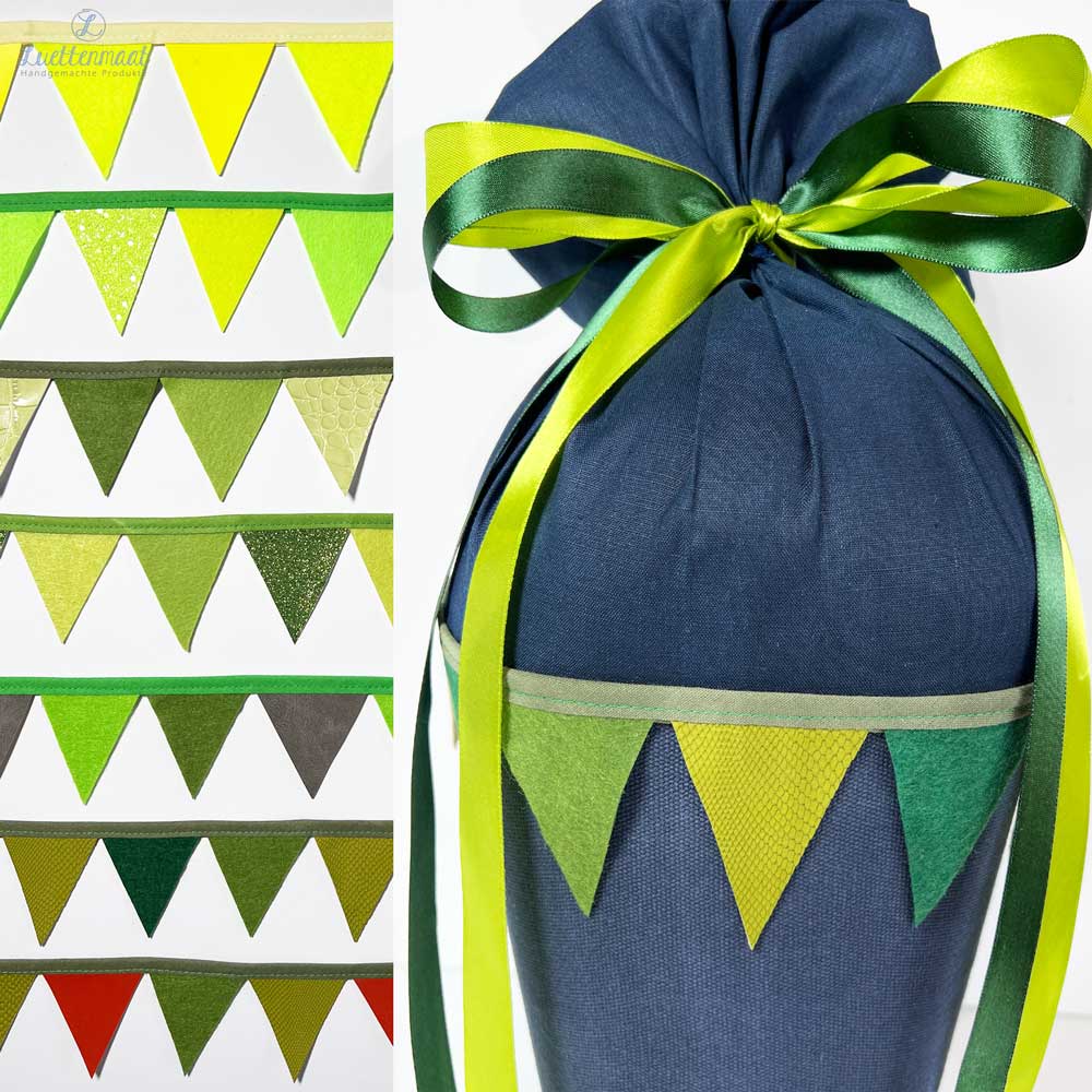 Die Wimpelkette kann mit Heißkleber aufgeklebt oder auf eine Stoffschultüte festgenäht werden.