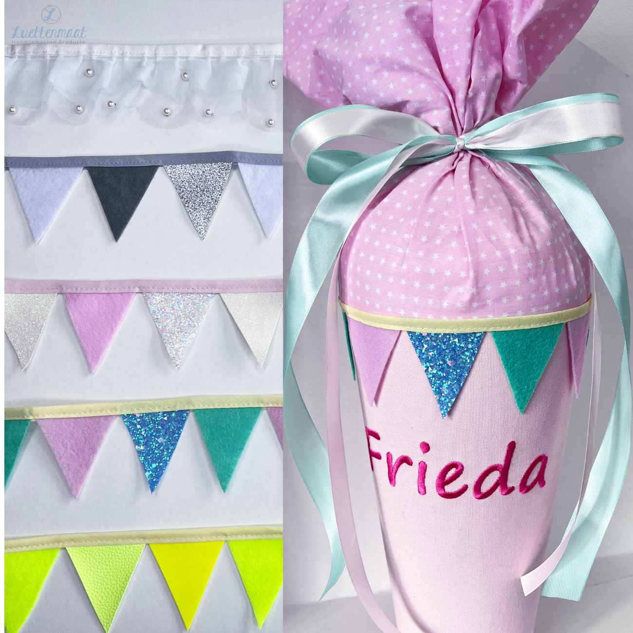 Die Wimpelkette kann mit Heißkleber aufgeklebt oder auf eine Stoffschultüte festgenäht werden.